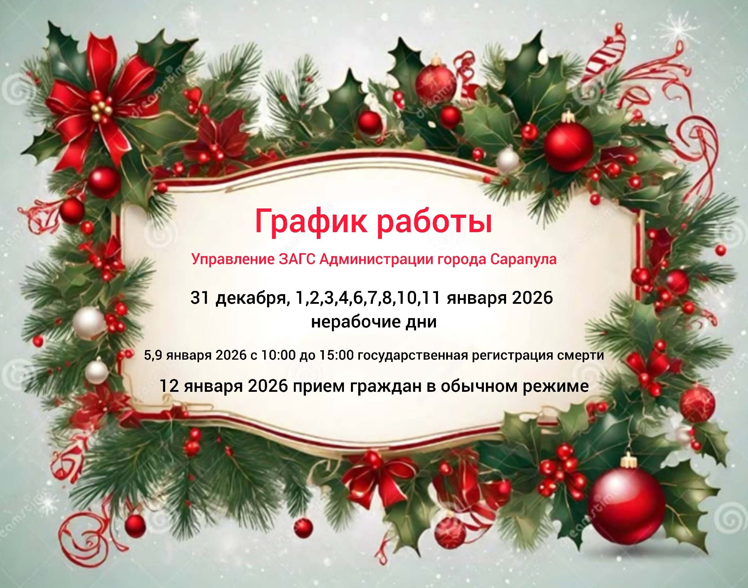 Режим работы в праздничные дни Управления ЗАГС Администрации города Сарапула.