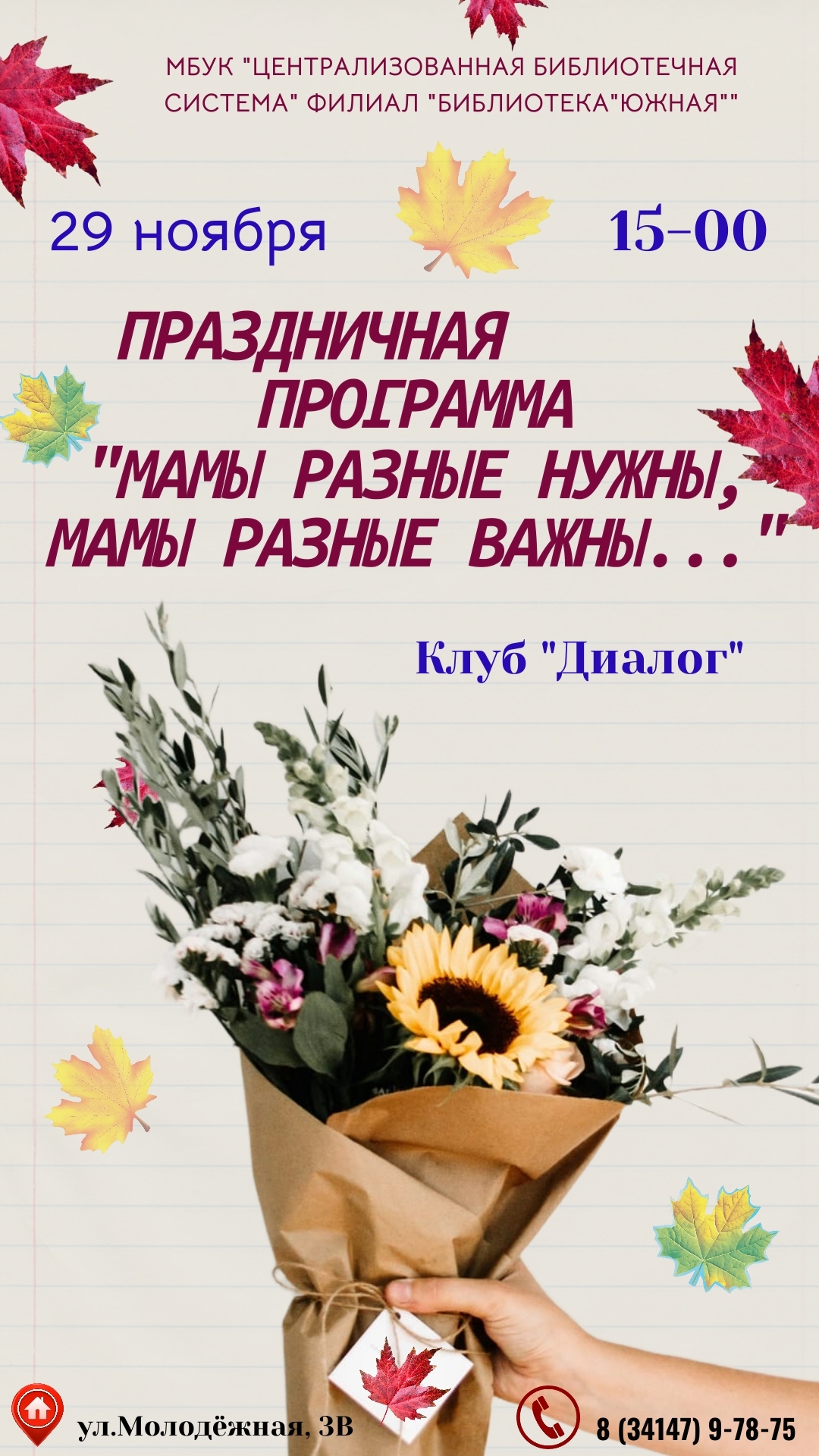 | Праздничная программа «Мамы разные важны, мамы разные нужны» в клубе «Диалог» | Библиотека «Южная» |