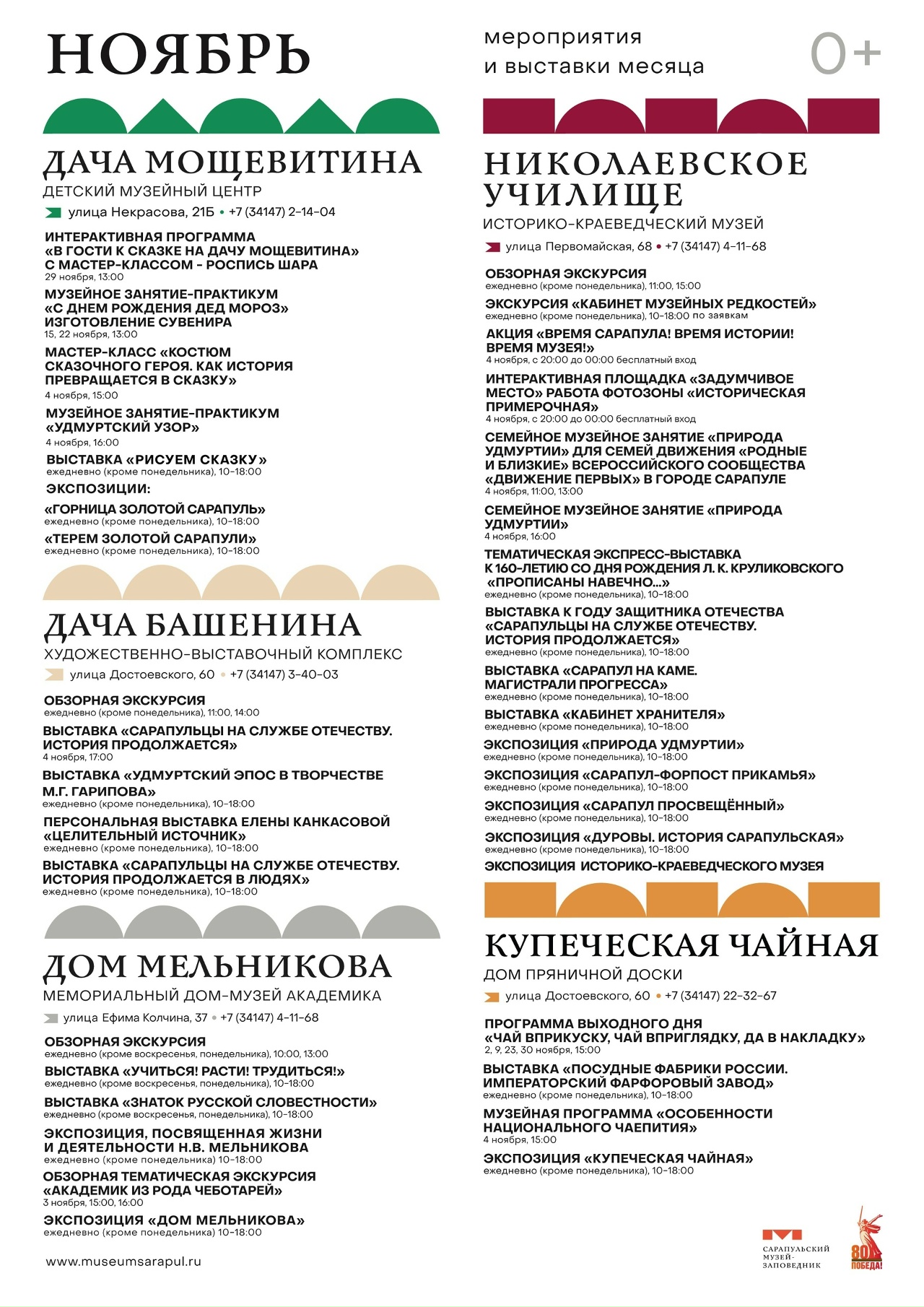 Весь экскурсионный маршрут заасфальтирован, приведен в порядок, везде установлены аншлаги, указатели и информационные щиты с «бар-кодами». ОТНЫНЕ САРАПУЛЬЦЫ И ГОСТИ ГОРОДА СМОГУТ САМИ ПРОЙТИ ПО ДАННОМУ МАРШРУТУ, почерпнув массу интересной информации об уникальных памятниках истории и архитектуры и замечательных личностях прошлого, а ЕСЛИ НЕОБХОДИМА ПОДРОБНАЯ ИНФОРМАЦИЯ ПО МАРШРУТУ ЛИБО ВЫ ХОТИТЕ ЗАКАЗАТЬ ЭКСКУРСИЮ, пожалуйста, ОБРАЩАЙТЕСЬ В МУЗЕЙ ПО ТЕЛЕФОНУ (34147) 4-11-68.