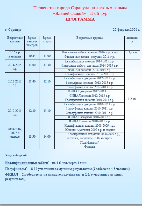 Начало соревнований 22 февраля в 11.00, время стартов во всех возрастных группах сдвигается на 1 час позднее.