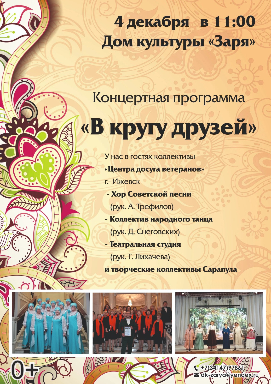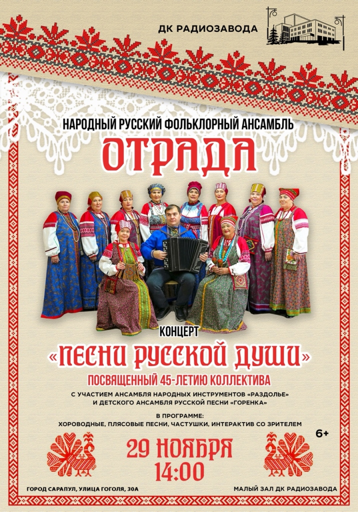 | Юбилейная программа «Песни русской души» народного русского фольклорного ансамбля «Отрада» | Дворец культуры радиозавода |