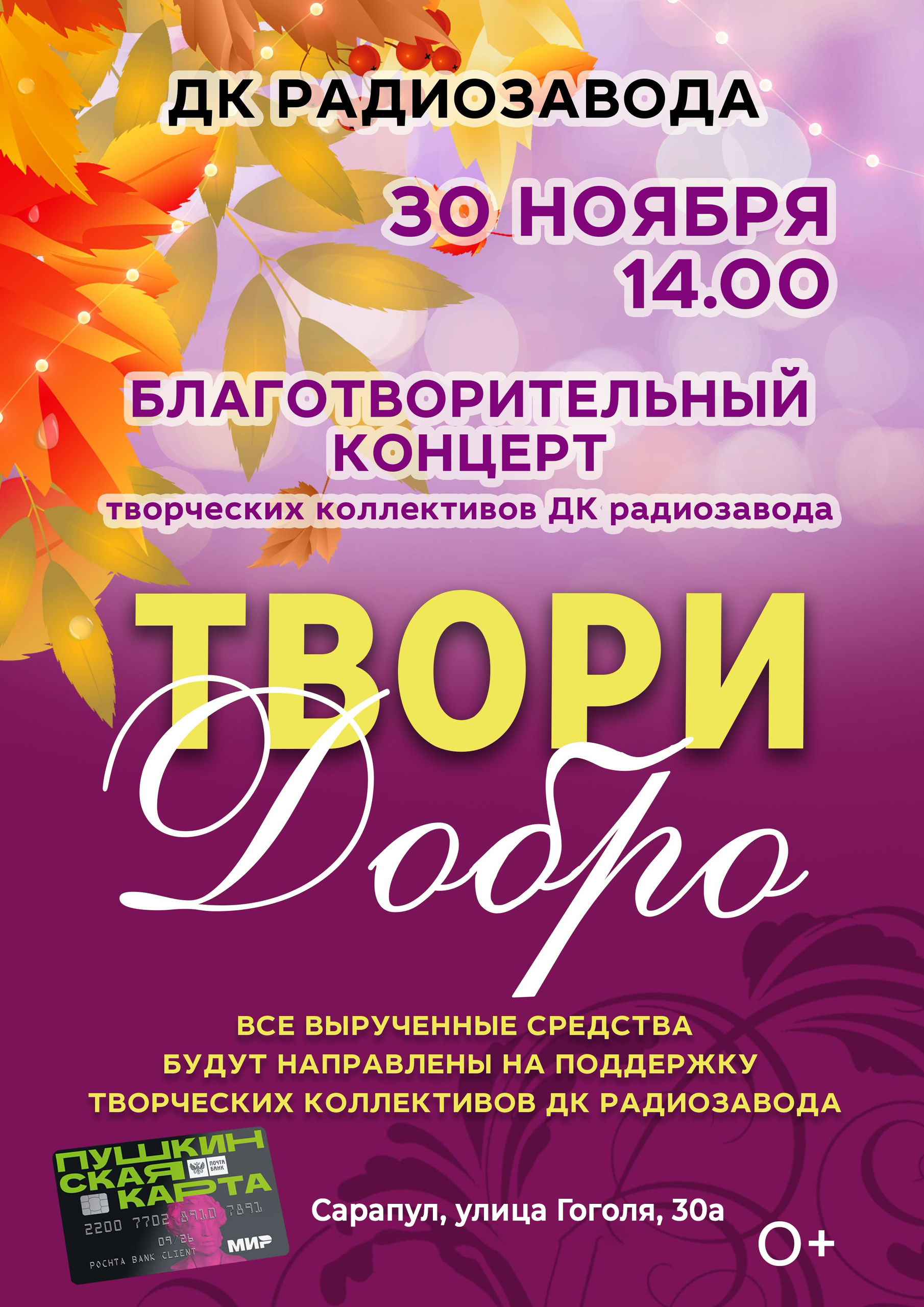 | Благотворительный концерт «Твори добро» | Дворец культуры радиозавода |